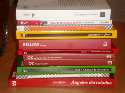 16:05: Nada más comer endilgo los críos a los abuelos y me escapo corriendo a ver libros. Recorro Luque, Beta y El Corte Inglés. Encuentro un libro de Denis Johnson que llevaba años queriendo leer. Al final, el resultado de la cacería es éste: